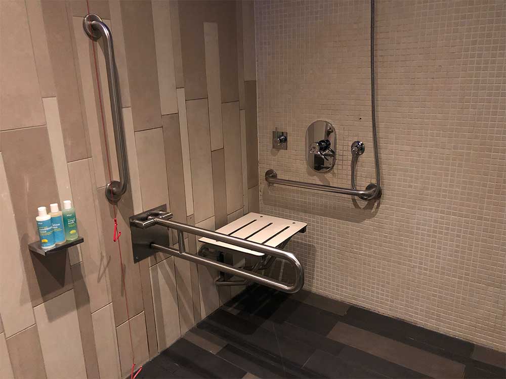 Like the toilet, there was an emergency pull cord located near the shower, but it was a bit too far away from the seat to be of much use.