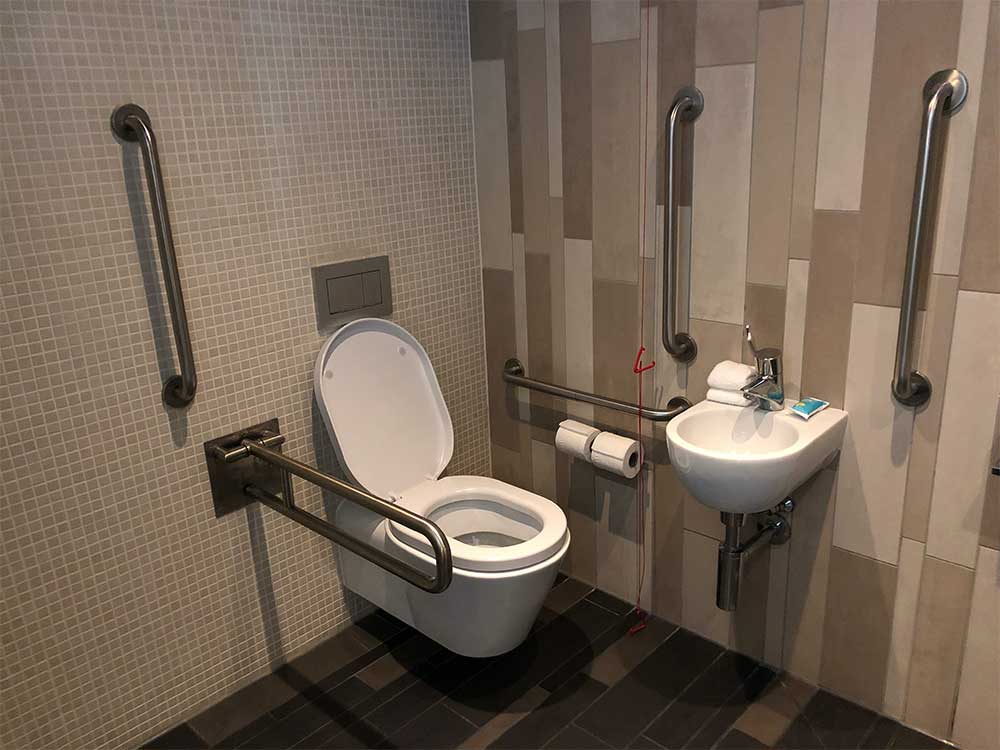 The toilet was accessible, with space to park a wheelchair directly alongside the seat for a safe transfer. Both vertical and horizontal grab bars were affixed to the wall, and a small sink for washing was a nice touch. An emergency pull cord situated in front of the toilet is an important safety feature.