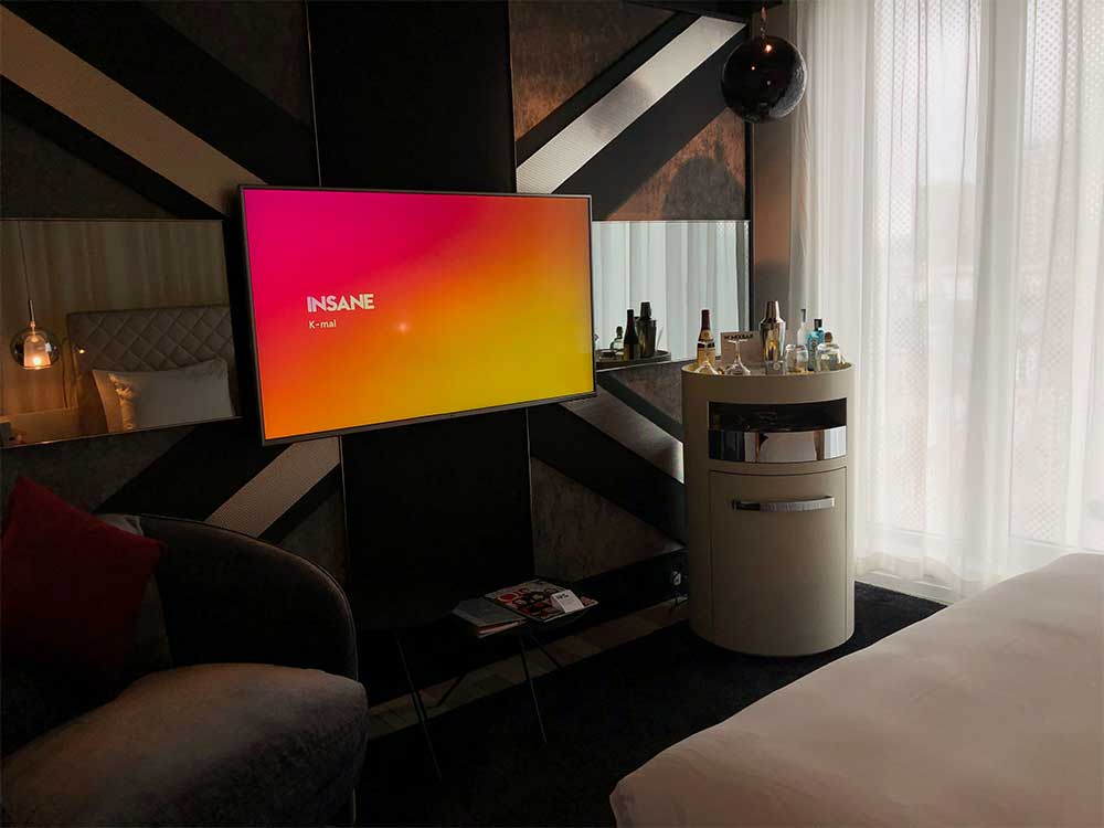 A large, high-definition television was mounted on the wall opposite the foot of the bed. A mini-bar stocked with high-quality beer, wine and spirits was located nearby, but the prices were high. This is a luxury hotel in London, after all.