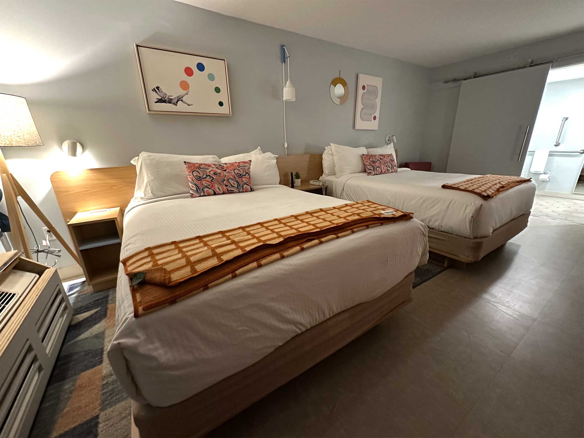 The “Standard 2 Queen” room I was assigned was a standard room type, and it certainly felt that way — it was cramped compared to the spaciousness of a room with one bed, but I was still able to maneuver my power wheelchair. The room's design was cute, with retro touches throughout.