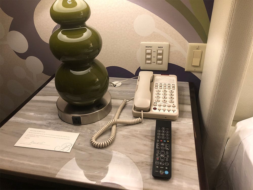The only power outlet accessible next to the bed was in the base of a lamp. These outlets don’t always provide sufficient current to charge wheelchairs effectively, so I stretched my charger from a wall outlet across the room. Buttons to control the drapes were placed on the wall next to the bed and within reach. I love electronic curtains!