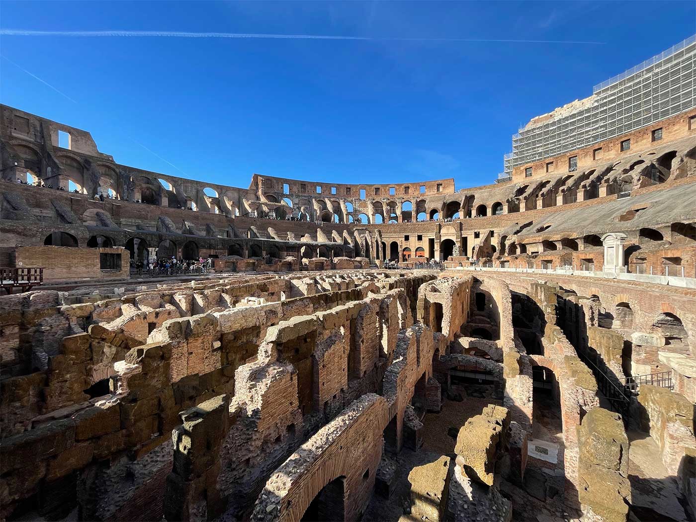 Passing through the archway, visitors will emerge into the heart of the arena. It is the area where the action happened — the field of play, if you will. Due to excavations of the Colosseum’s subterranean rooms and corridors, much of the wooden and earthen platform covering the underground area no longer exists. From what remains of this ground level, visitors can peer down into the excavated areas.