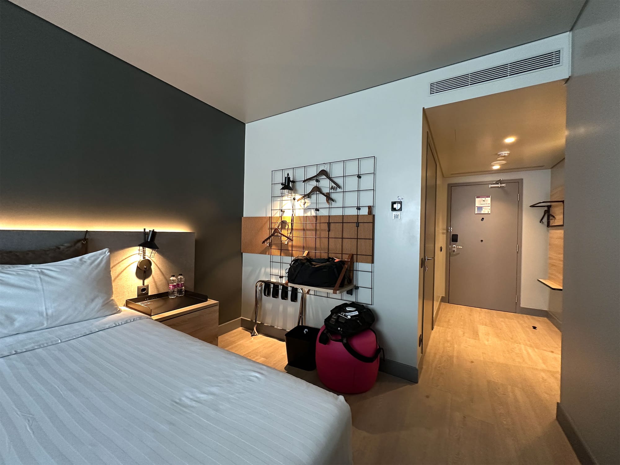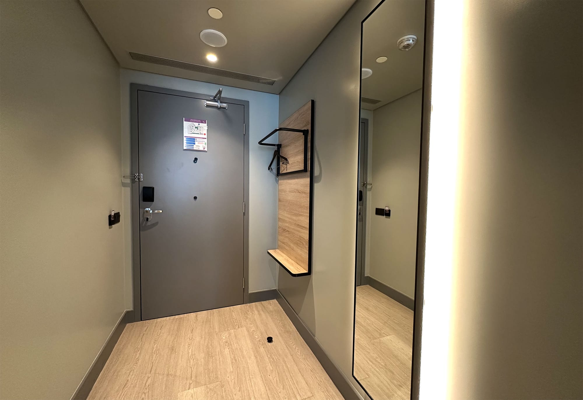 On the wall opposite the bed was a wall-mounted television. The room did not have a closet, however there were hanging racks next to the bed and at the main entry door. A full length mirror was provided in the foyer area.