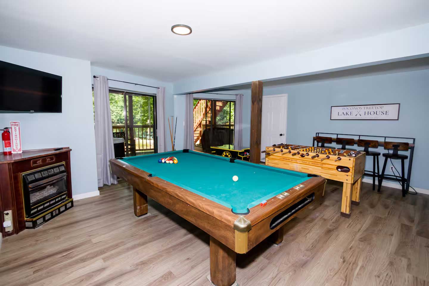 Rain or shine, there’s no shortage of activities to enjoy. The game room on the ground floor features a billiards table, foosball, arcade games, a Star Wars digital pinball machine, and more. If you prefer the outdoors, the property includes a variety of recreational options, such as a basketball hoop, outdoor ping pong table, cornhole, bocce ball, and even laser tag.