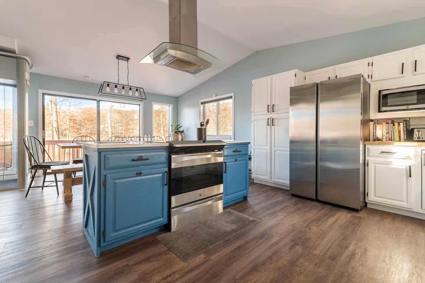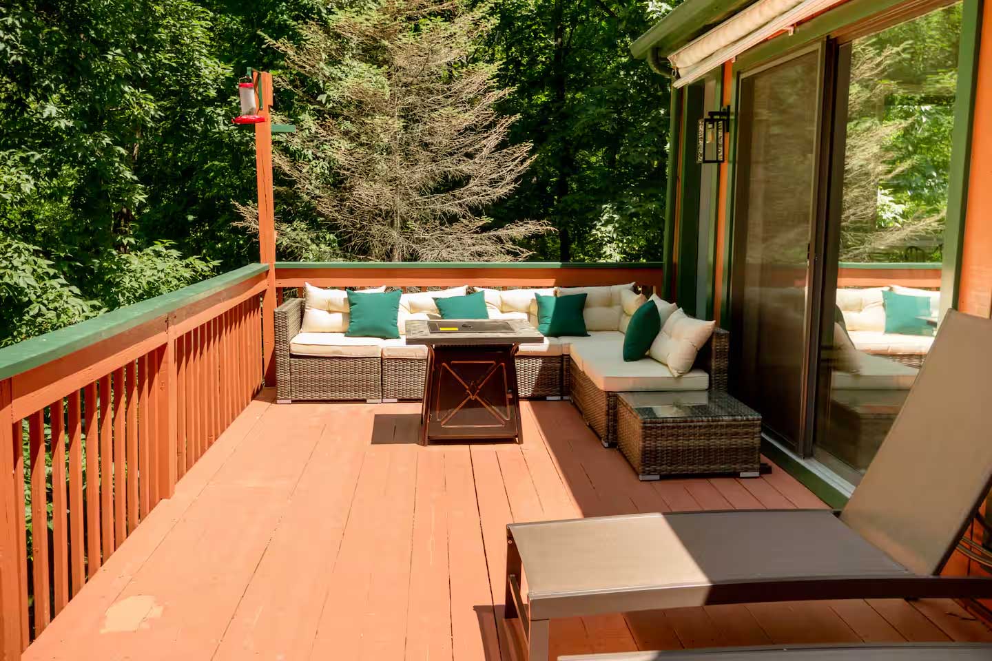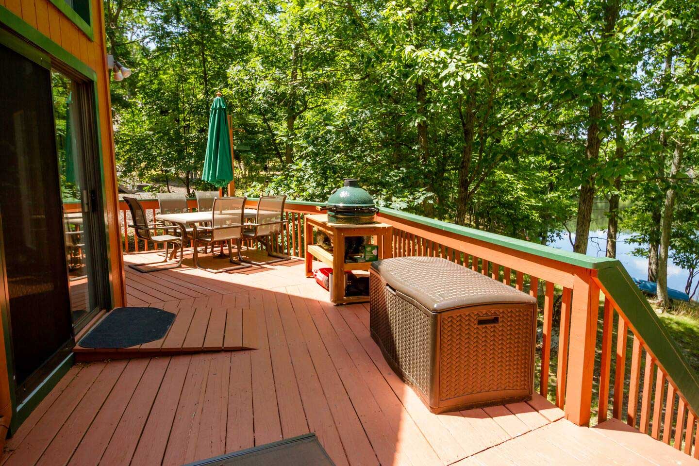 Step outside to one of three large decks, each offering a unique way to soak in the serene surroundings. The main deck includes a propane fire table, sectional seating, and a Big Green Egg BBQ smoker. The ground-level deck boasts a seven-person hot tub and Adirondack rocking chairs, while a third deck features hammock swings and an outdoor sauna—perfect for unwinding after a day of exploring.