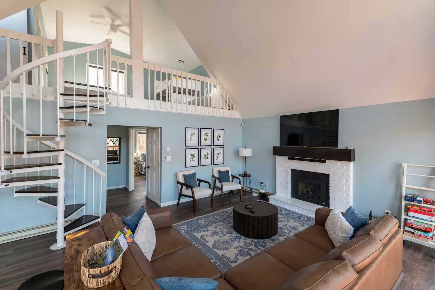 With high-speed WiFi, five Smart TVs, a dedicated work desk, and an EV charger, this home offers modern conveniences alongside rustic charm. A driveway accommodating up to seven vehicles ensures plenty of space for guests.