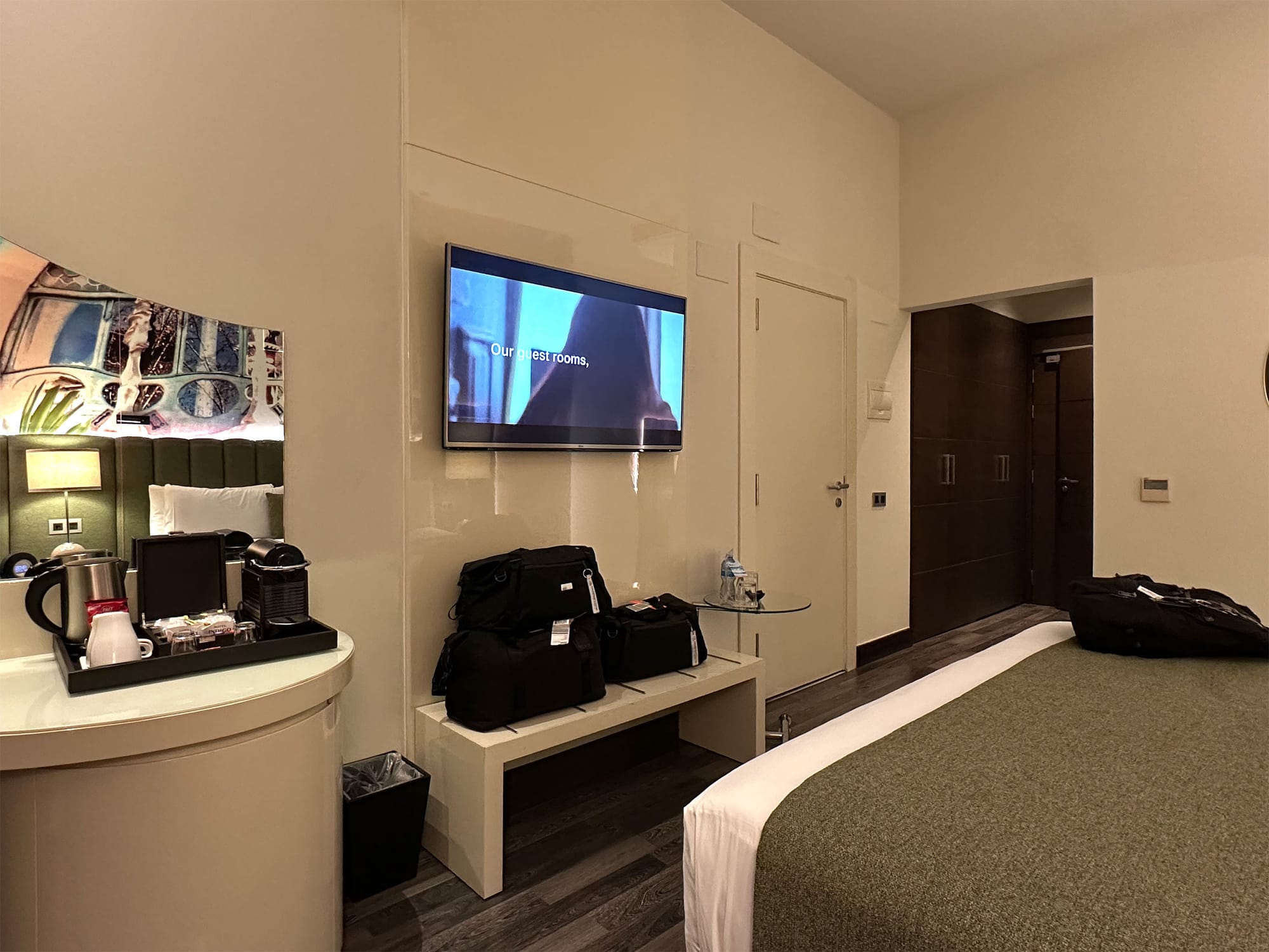 On the wall opposite the bed was a wall-mounted television, desk, and mini fridge. The desk was 30 inches high, with 27.5 inches of clearance below. The room did offer a connecting room feature, though I am not certain what type of room it connects to specifically.