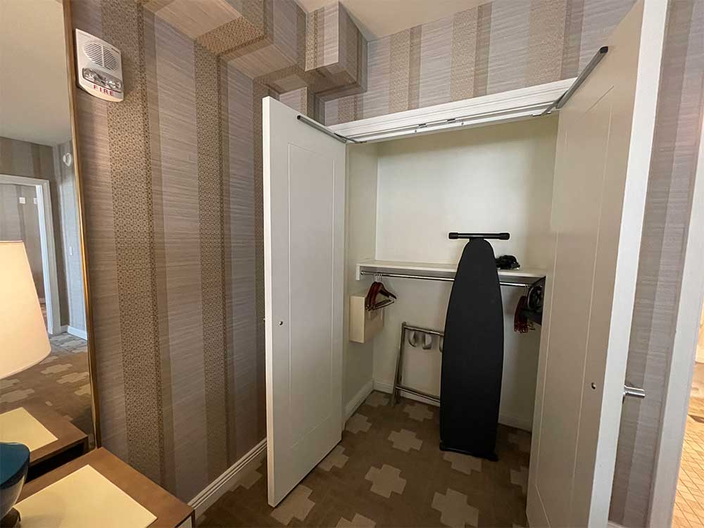 Opposite the bed was a chest of drawers, wall-mounted television and a mini-bar. A closet with double doors was located to the right of the bed, which featured a reduced height clothing rod, iron with ironing board and a safe for securing valuables.