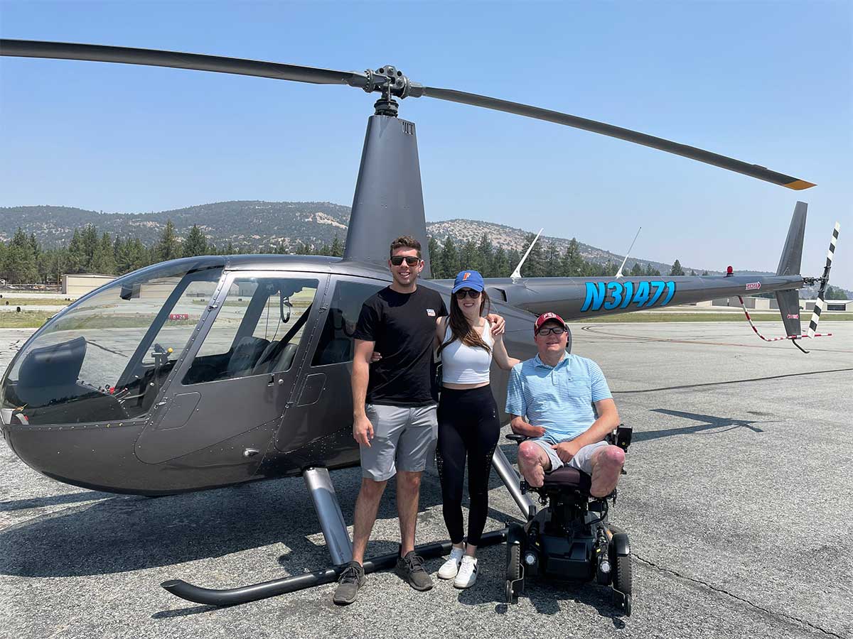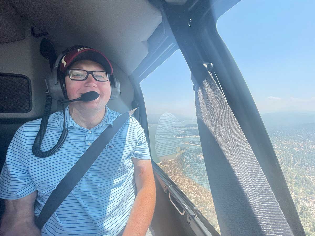Those who have followed this blog for awhile know that I am an aviation geek — the rare wheelchair user who actually enjoys flying! Big Bear City, which is located next to the lake of the same name, features a high-elevation airport, aptly named Big Bear Airport. There, the company Helicopter Big Bear offers affordable helicopter tours to visitors. We decided to go up for an aerial tour — the 15-minute “Tour Kilo” spanned a 24-mile route around the lake and cost our group of 3 people only $195.00. It was a great value and a fantastic way to end our visit to the San Bernardino National Forest!