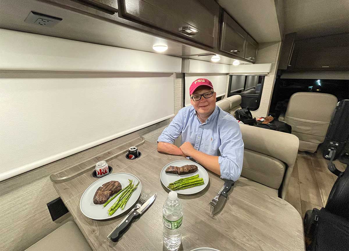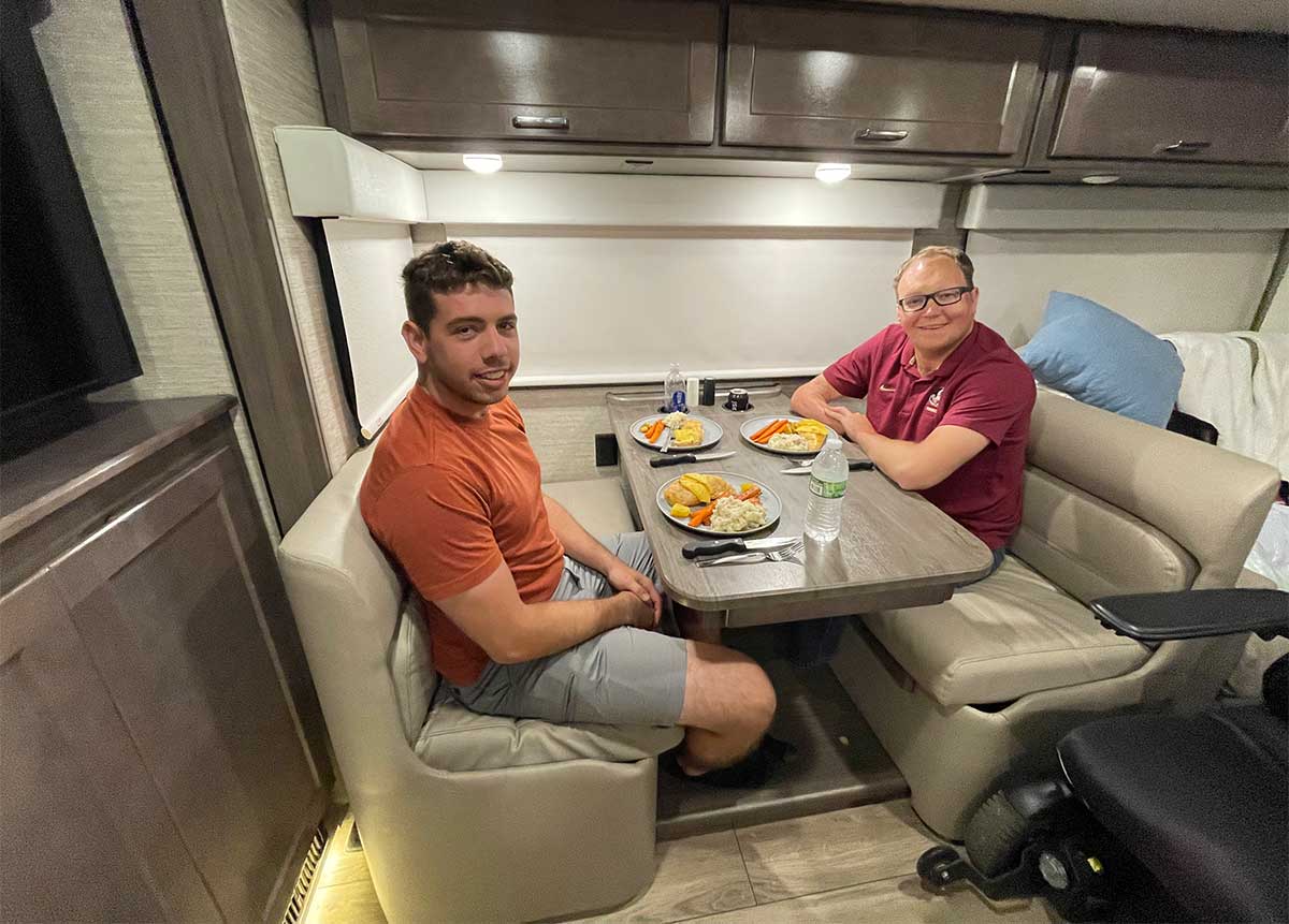 Speaking of food, we ate well during our trip! We cooked steak, poultry, ribs and loads of vegetables using the Winnebago Inspire’s kitchen. The food tasted great, no different than if we had been at home! In order to be closer to my family, I opted to transfer from my wheelchair and into the booth-style seating at the dining table, but this isn’t necessary. A slide-out extension increases the table width to accommodate those who wish to remain seated in their own wheelchairs.