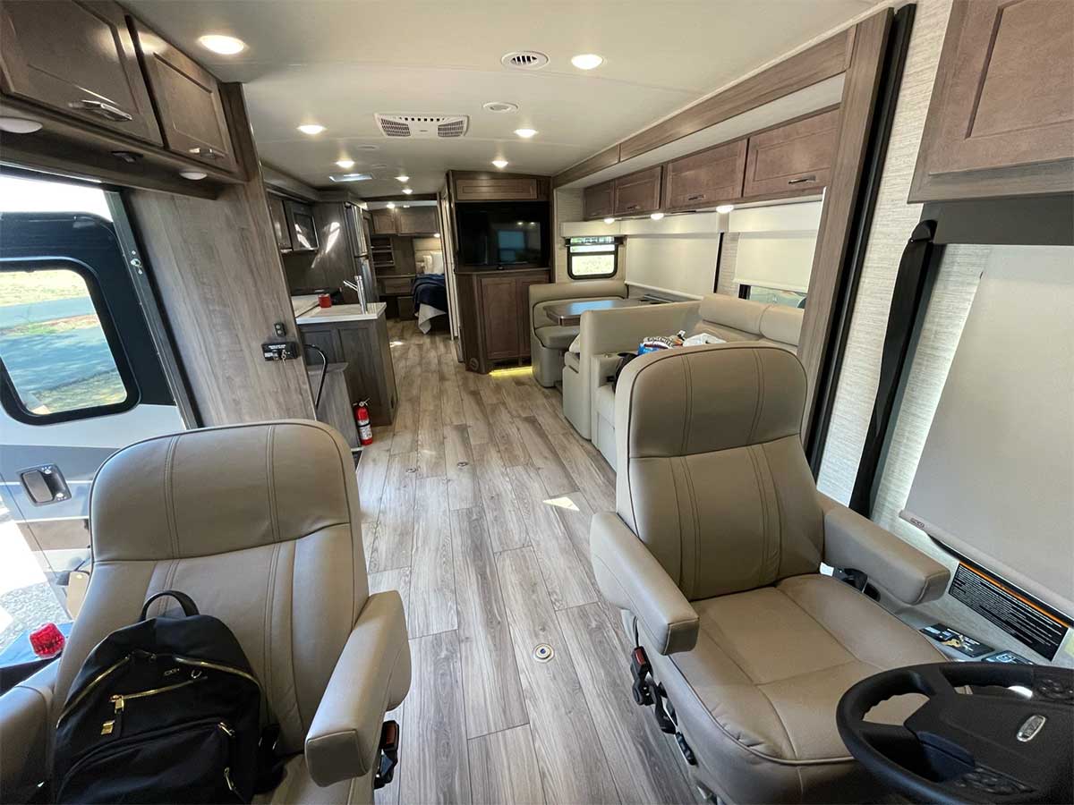 Two captain’s chairs sit at the front of the Winnebago Inspire RV — one for the driver and another for a passenger. The seats featured adjustable arm rests, swivel, fixed lumbar support, and multi-adjustable recline. Because the passenger seat swiveled, I was able to safely transfer into it from my wheelchair, offering me exceptional views of the road ahead!